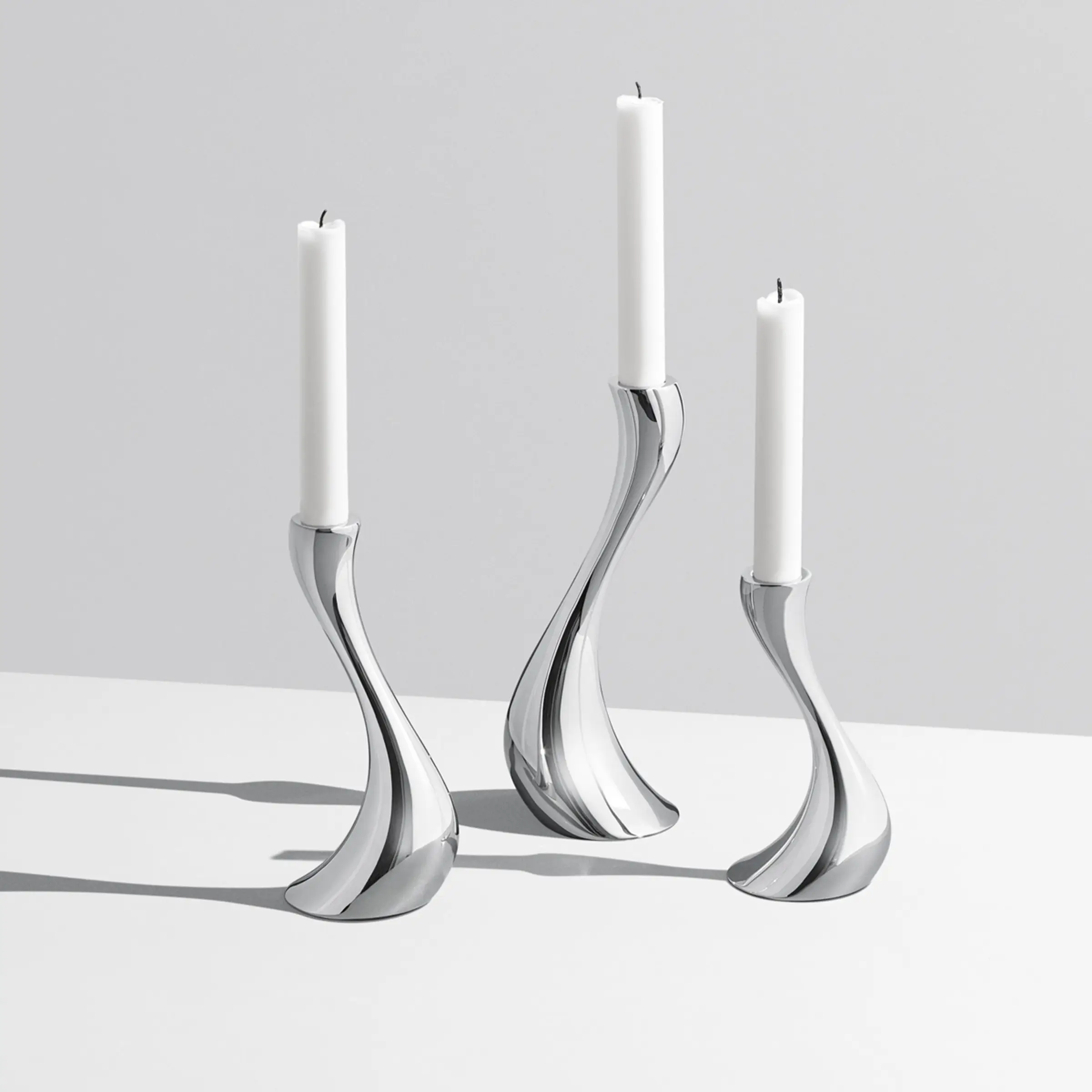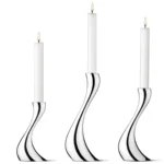 Şüphesiz Georg Jensen’ın en tanınan ve ikonik şamdanlarından biri olan Cobra, duyusal ve akışkan formuyla birçok kişinin kalbini fethetmiştir. Yerçekimine meydan okur gibi görünen bu hafiflik, neredeyse büyüleyici bir etki yaratır – özellikle titreyen mum ışığı yüzeyde yansıdığında bu etki iki katına çıkar. Küçük, orta ve büyük boylardan oluşan bu üçlü şamdan seti, doğal bir uyum içinde bir araya gelerek adeta bir yılan gibi sağa sola salınıyor gibi görünür.