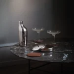Aynalı görünümlü kapaklı çelik kutu içerisinde, deri bardak altlığı