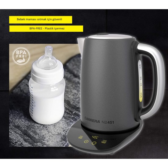 Bebek maması için 40 °C’ye, hassas yeşil çaylar için 80 °C’ye, kahve için 90°C’ye veya mikropsuz su için 100 °C’ye ayarlasanız da, Carrera su ısıtıcısı istenen sıcaklığa ulaştığında otomatik olarak kapanır.