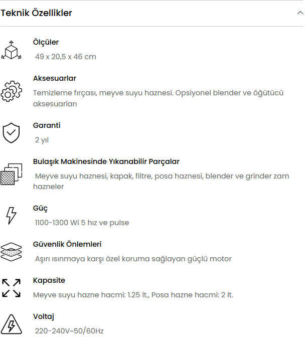 MultiJuicer, meyve suyu sıkma, karıştırma ve öğütme işlemlerini tek bir cihazda birleştirerek mutfakta pratik bir çözüm sunar. 84 mm genişliğindeki besleme haznesi sayesinde meyve ve sebzeleri doğramadan sıkabilir, 2L posa haznesi ve 1,2L meyve suyu sürahisi ile kesintisiz bir kullanım deneyimi yaşayabilirsiniz. Dijital kontrol paneli, 5 hız seviyesi ve pulse fonksiyonu ile farklı malzemeler için ideal sonuçlar sağlar. 1300 Watt motoru, aşırı ısınma korumasıyla güçlü ve güvenli bir performans sunarken, titanyum güçlendirilmiş paslanmaz çelik filtresi ile maksimum besin ve vitamin değerlerini korur. Kolay temizlenebilir parçaları bulaşık makinesinde yıkanabilir özelliktedir. Emniyet kolu ve kaydırmaz ayakları ile güvenli kullanım sunan MultiJuicer, mutfakta hız, pratiklik ve yüksek performans arayanlar için mükemmel bir seçenektir.