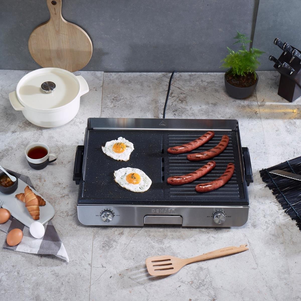 Çok Yönlü Kullanım: Balık, sebze, pankek ve omlet gibi yemekleri düz yüzeyde hazırlarken, oluklu yüzeyde et, burger ve sosis pişirebilirsiniz.
