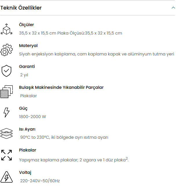 Cihaz, 2 oluklu ve 1 düz pişirme plakasıyla gelir. Oluklu plakalar, et, tavuk ve sosisleri mühürleyerek mükemmel çıtır dış yüzey ve sulu iç kısım sağlar. Düz plaka ise yumurta, krep, sotelenmiş sebzeler veya hassas deniz ürünleri için idealdir. Tüm plakalar bulaşık makinesinde yıkanabilir, böylece temizlik zahmetsiz hale gelir.