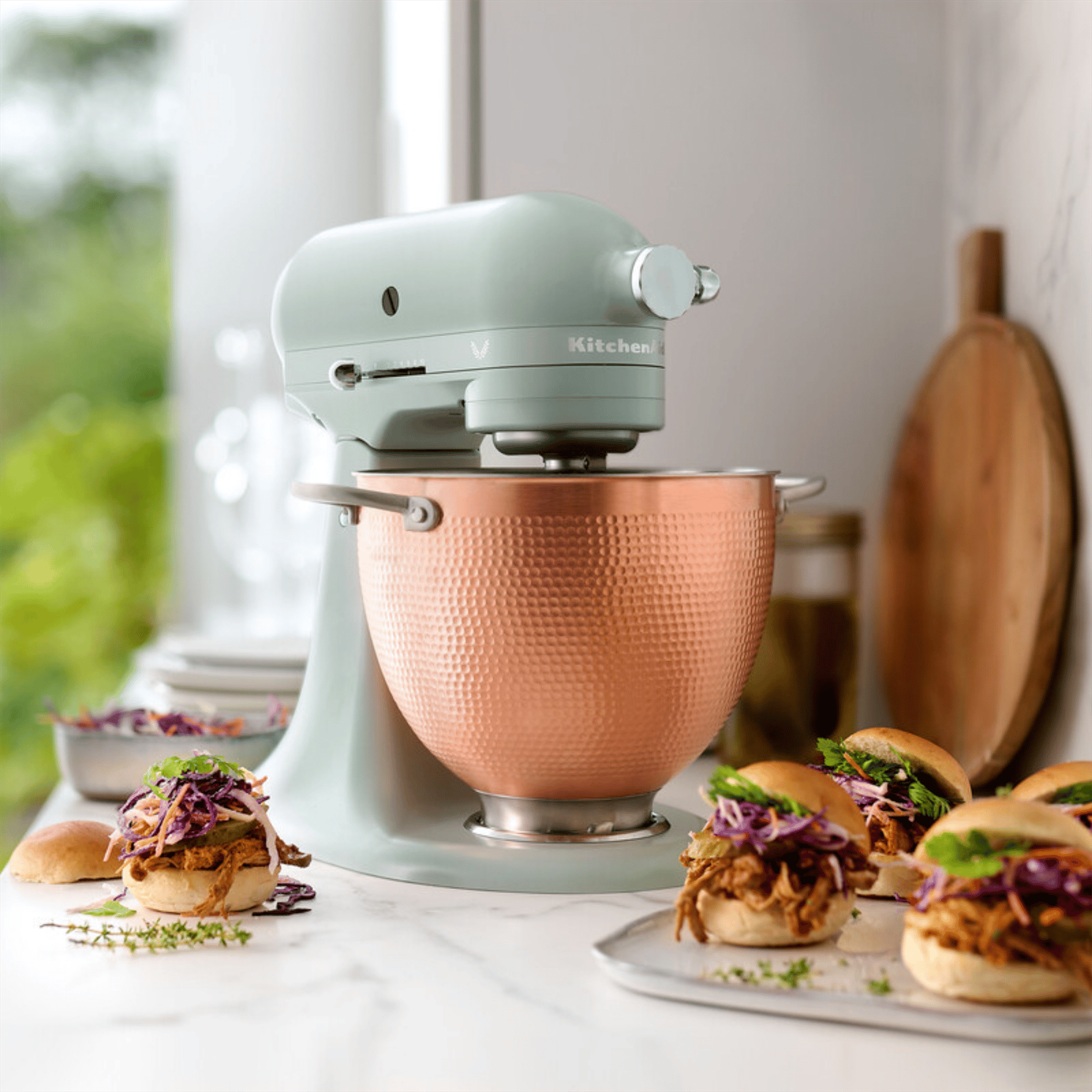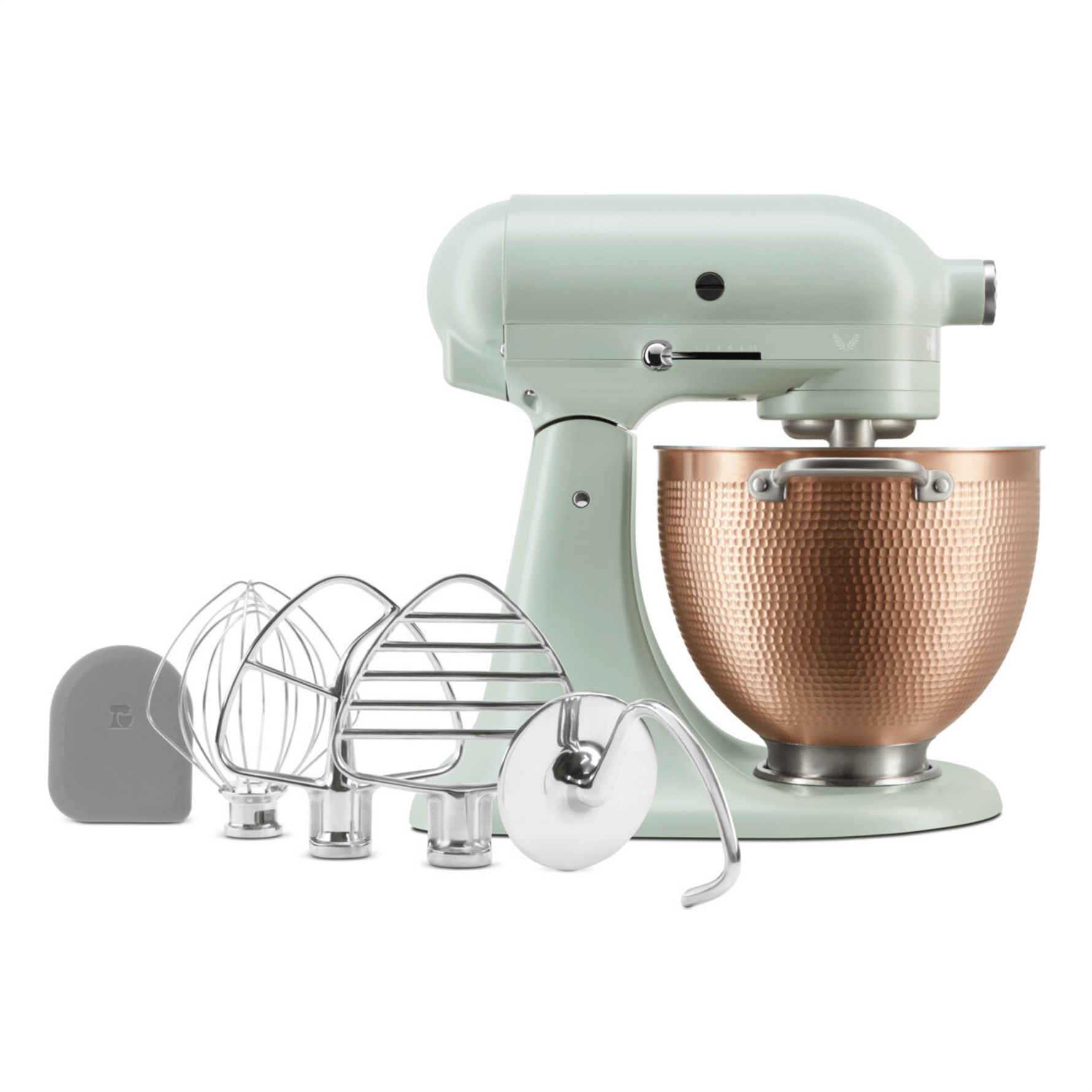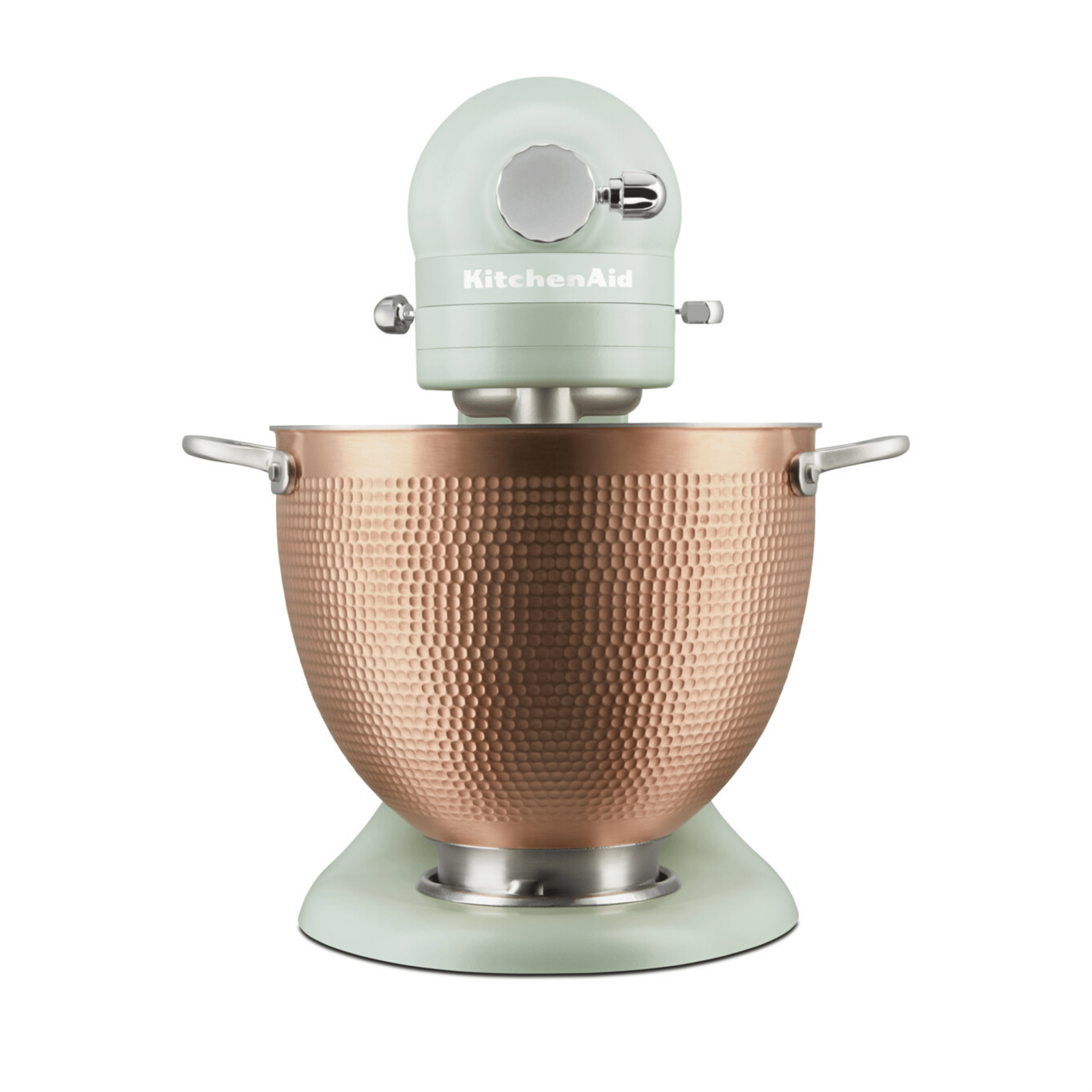 Kadifemsi saten kaplamaya sahip yumuşak kekik yeşili Blossom stand mikser ve stilini ortaya koyan dövme bakır kaseyi keşfedin. Zaman içinde oluşan benzersiz desenler ve dokular, eşsiz bir görünüm sunar.