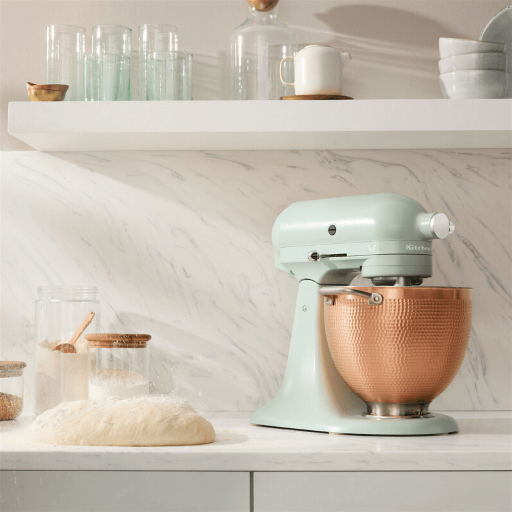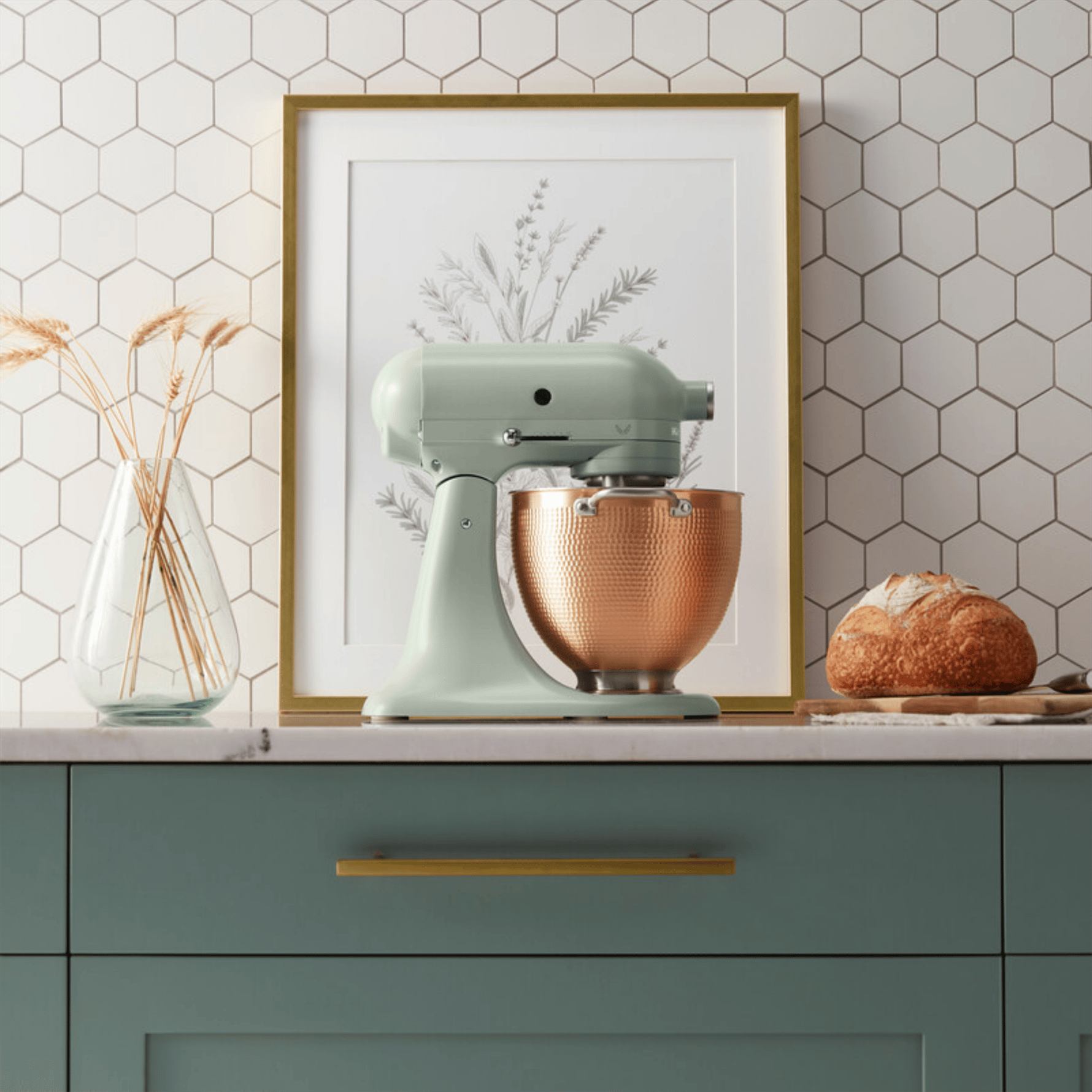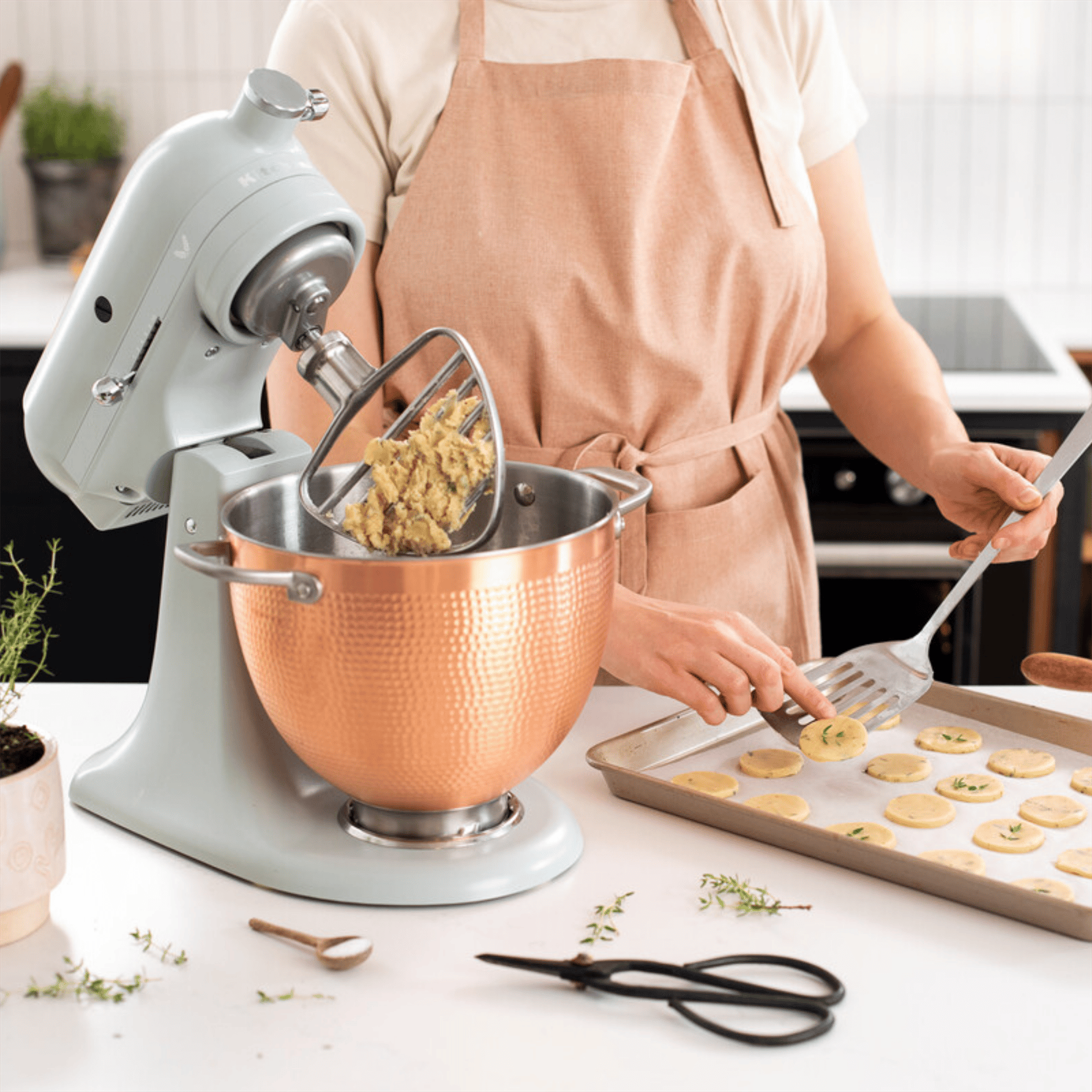 Kadifemsi saten kaplamaya sahip yumuşak kekik yeşili Blossom stand mikser ve stilini ortaya koyan dövme bakır kaseyi keşfedin. Zaman içinde oluşan benzersiz desenler ve dokular, eşsiz bir görünüm sunar.