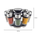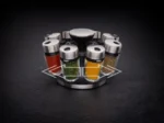Paslanmaz çelik vurgulara sahip şık ve çağdaş bir baharat seti. Eşsiz bir kavanoz asma sistemi ve döner tabana sahiptir.