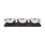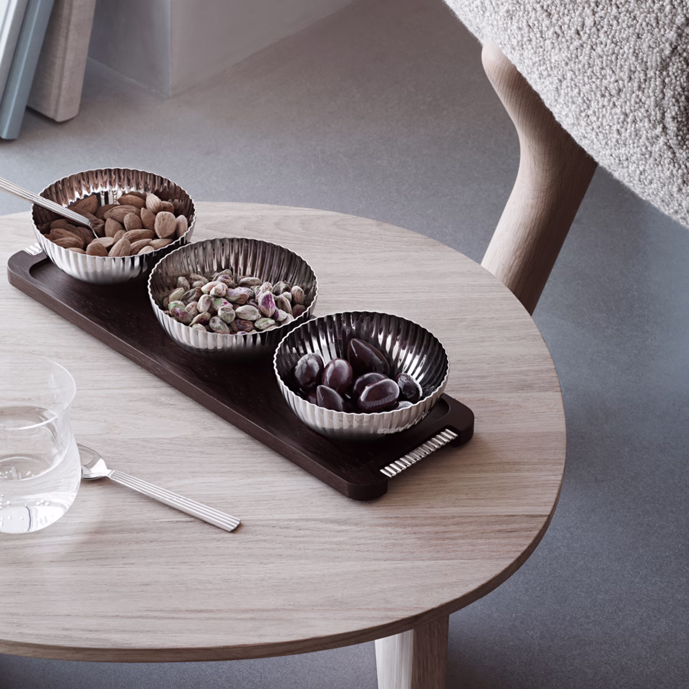 Eğlencenizi yükseltin! Tüm küçük detayların mükemmel olduğundan emin olun ve özel yapım füme meşe tepside sunulan bu güzel üç paslanmaz çelik kase setinde atıştırmalıklarınızı servis edin. Şekerleri, fındıkları veya meyveleri tutmak için doğru boyutta olan kaseler, efsanevi tasarımcı Sigvard Bernadotte’nin ikonik parçalarının çoğunda görülen Art Deco’dan ilham alan kendine özgü oluklara sahiptir. Setin çok yönlü yapısı, hem tepsinin hem de kaselerin ayrı ayrı da kullanılabileceği anlamına gelir.