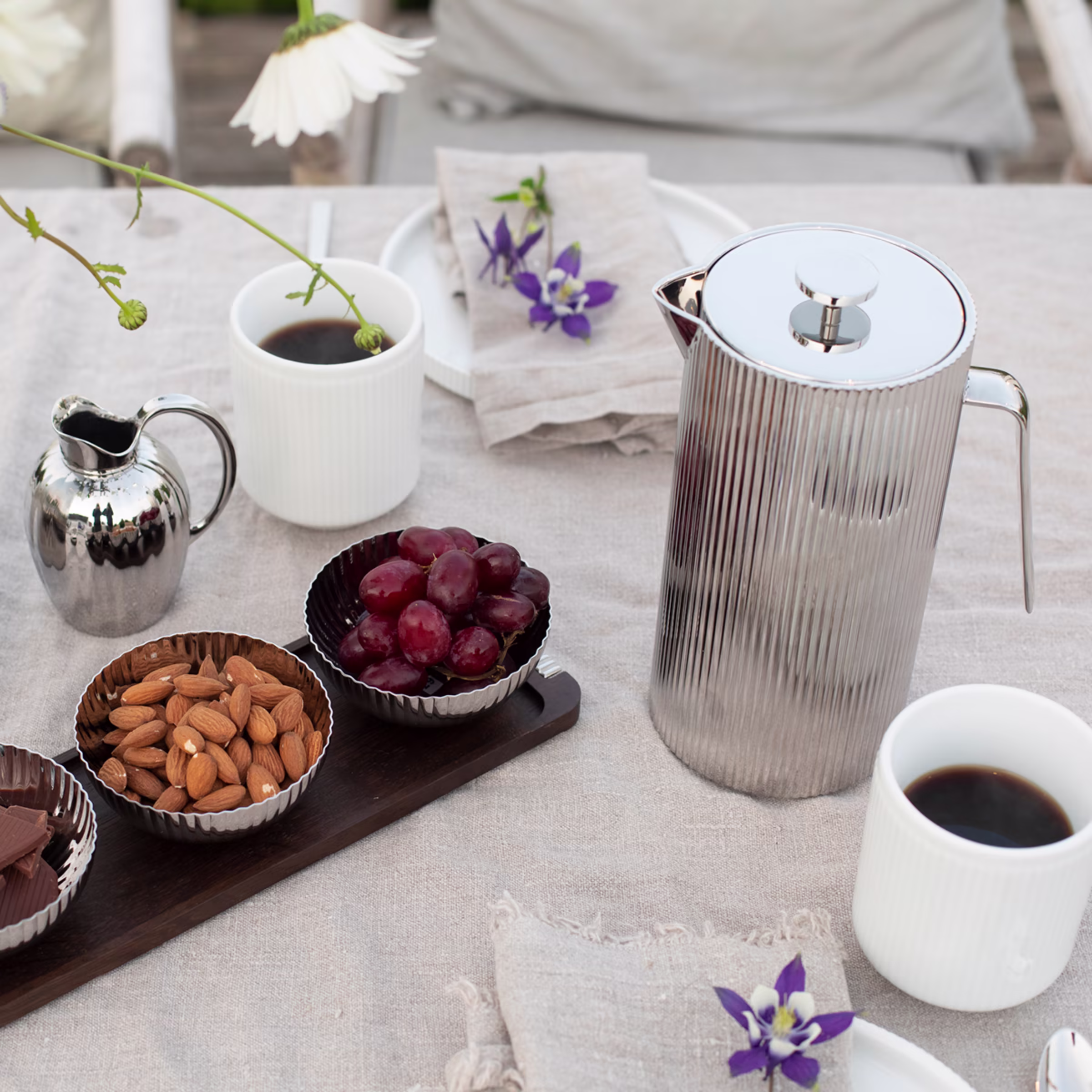 Bu Bernadotte Fransız kahve presinin ayırt edici ve zarif yivli yüzeyi, masaya Art Deco’nun şaşmaz bir dokunuşunu katıyor. Ayna cilalı paslamaz çelikten güzel bir şekilde hazırlanmış olan pres, kahveyi biraz daha sıcak tutmak için çift duvarlıdır ve paslamaz çelik filtrenin temizlenmesi kolaydır.