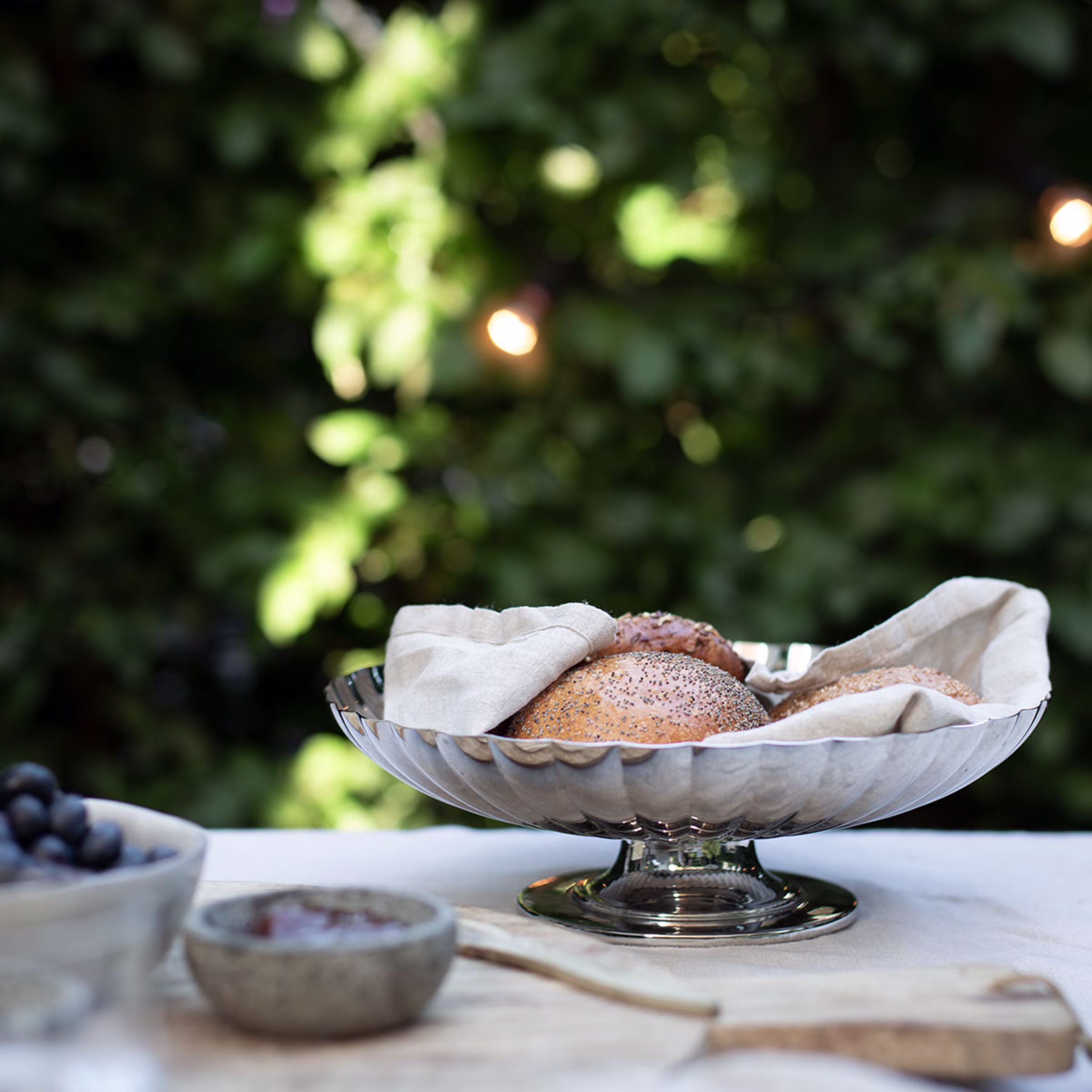 Sigvard Bernadotte’nin ikonik çalışmalarından ilham alan Georg Jensen tasarım ekibi, bu zarif yemeği bir stand üzerinde yarattı. Bernadotte’nin kendine özgü yivleri artık çanağın üzerine yayılıyor gibi görünürken, standın kendisi de onun orijinal şamdan tasarımlarından birinden alınmıştır. Bir masanın merkezinde, belki de meyve veya ekmek tutarken güzel bir şekilde çalışır.