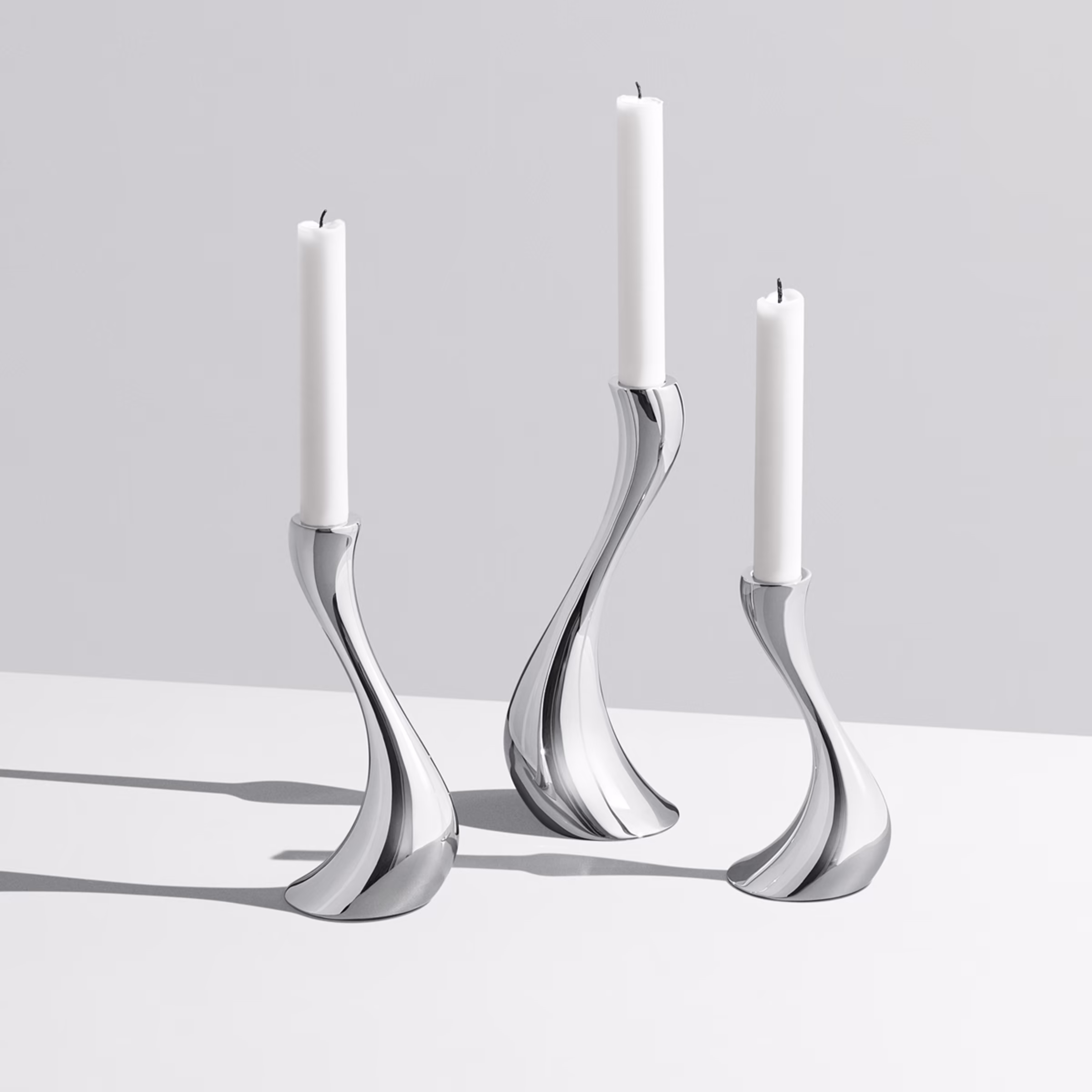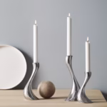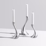 Kuşkusuz Georg Jensen’in en tanınabilir ve ikonik mumluklarından biri olan Kobra’nın şehvetli akıcı şekli birçok kişinin kalbini fethetti. Görünüşe göre yerçekimine meydan okuyan mumlukların hafifliği, titreşen mum ışığı yüzeye yansıdığında iki katına çıkan büyülü bir etkiye sahiptir. Üç şamdan oluşan bu set – küçük, orta ve büyük – şu şekilde sallanıyor gibi görünen güzel bir doğal grup oluşturuyor. Bir kobranın kendisi gibi.