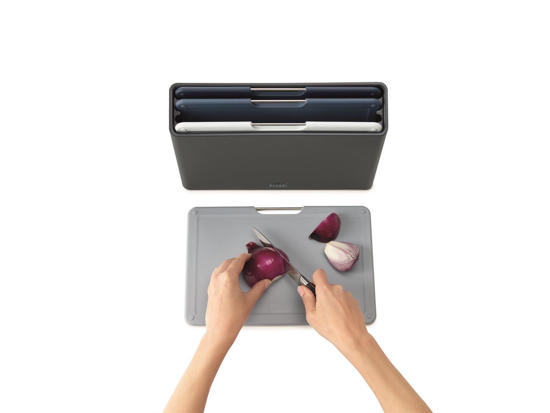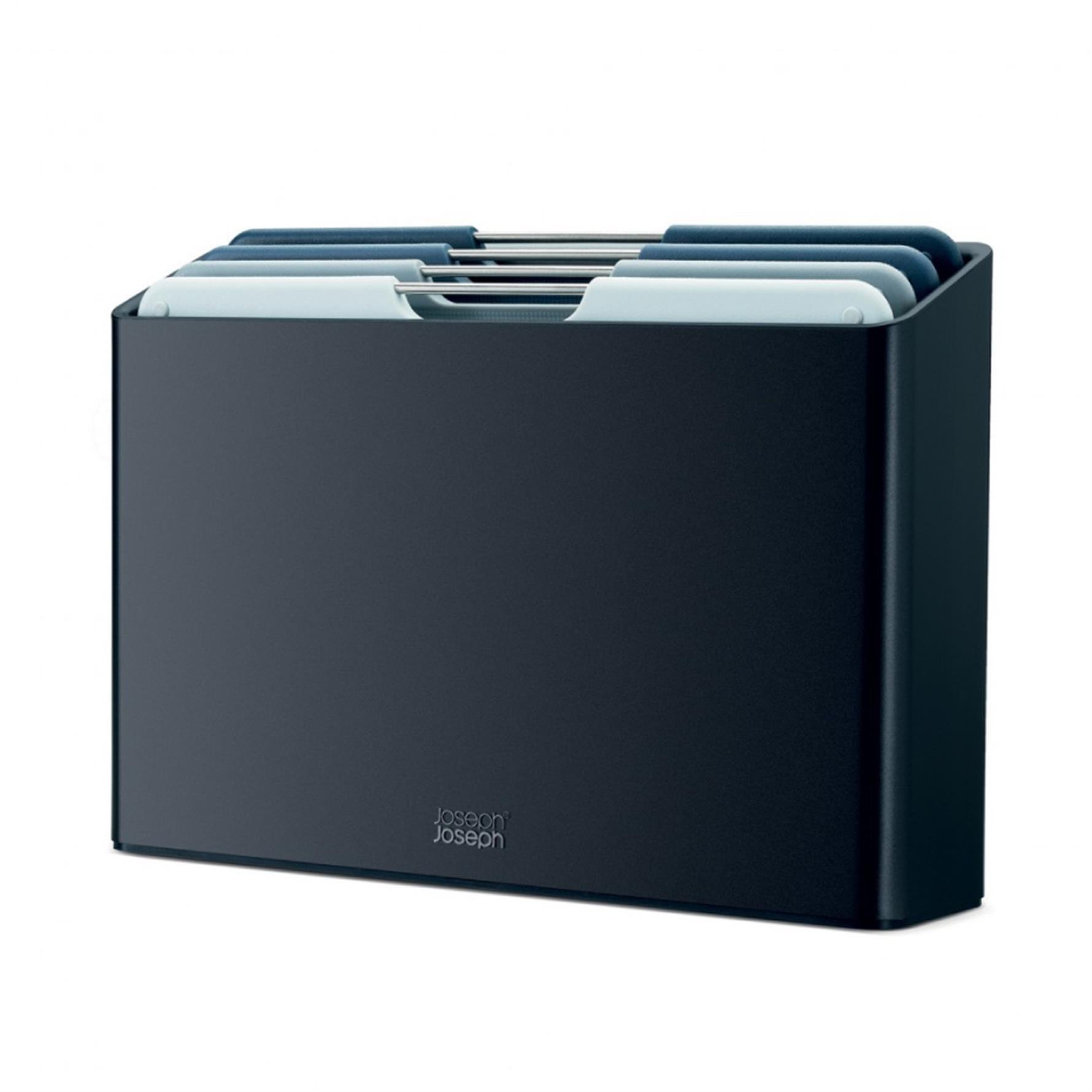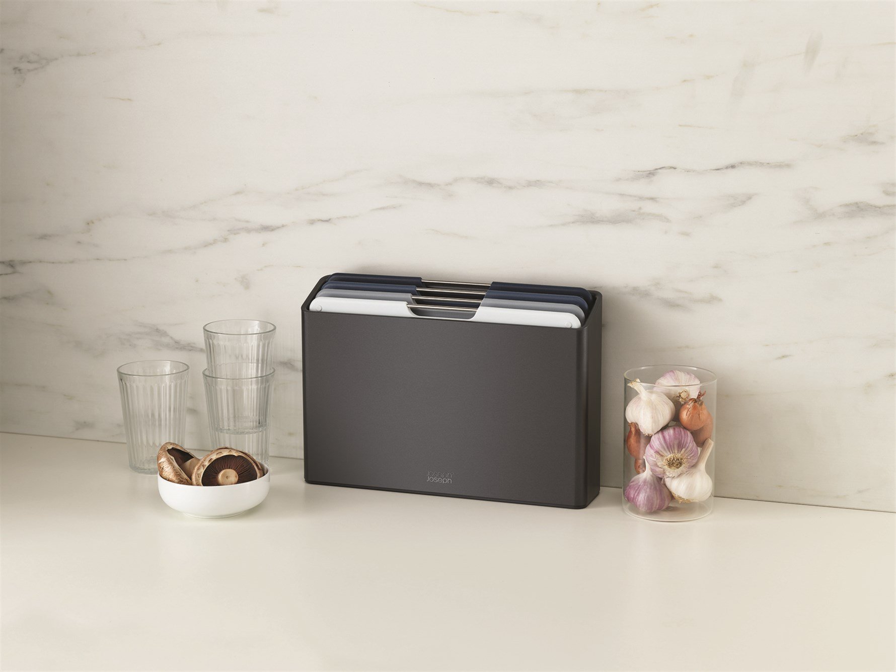 Tüm kesme tahtalarınızı bu şık tasarım ile düzenli saklayın. Her iki tarafında da kaydırmaz ayakları bulunan, bıçak dostu, dokulu kesme yüzeylerine sahip dört adet, büyük renk kodlu tahta içeren ince bir saklama kutusuna sahiptir. Akıllı, açılı tasarımı ve paslanmaz çelik tutacaklarıyla kasasından kolayca çıkarılabilir. Kasa, tahtaları birbirinden ayrı tutup hava dolaşımına izin verirken, kaydırmaz ayakları sağlam durur ve parmak izi bırakmaz. Farklı renk ve ebatlarda mevcuttur.