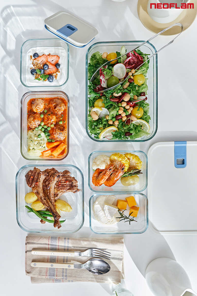 Neoflam Perfect Seal dikdörtgen cam saklama kabı, mükemmel tasarımı ve 400 derece ısıya dayanıklı borosilikat cam gövdesi ile yiyeceklerinizi uzun süre ilk günkü tazeliğinde korur.