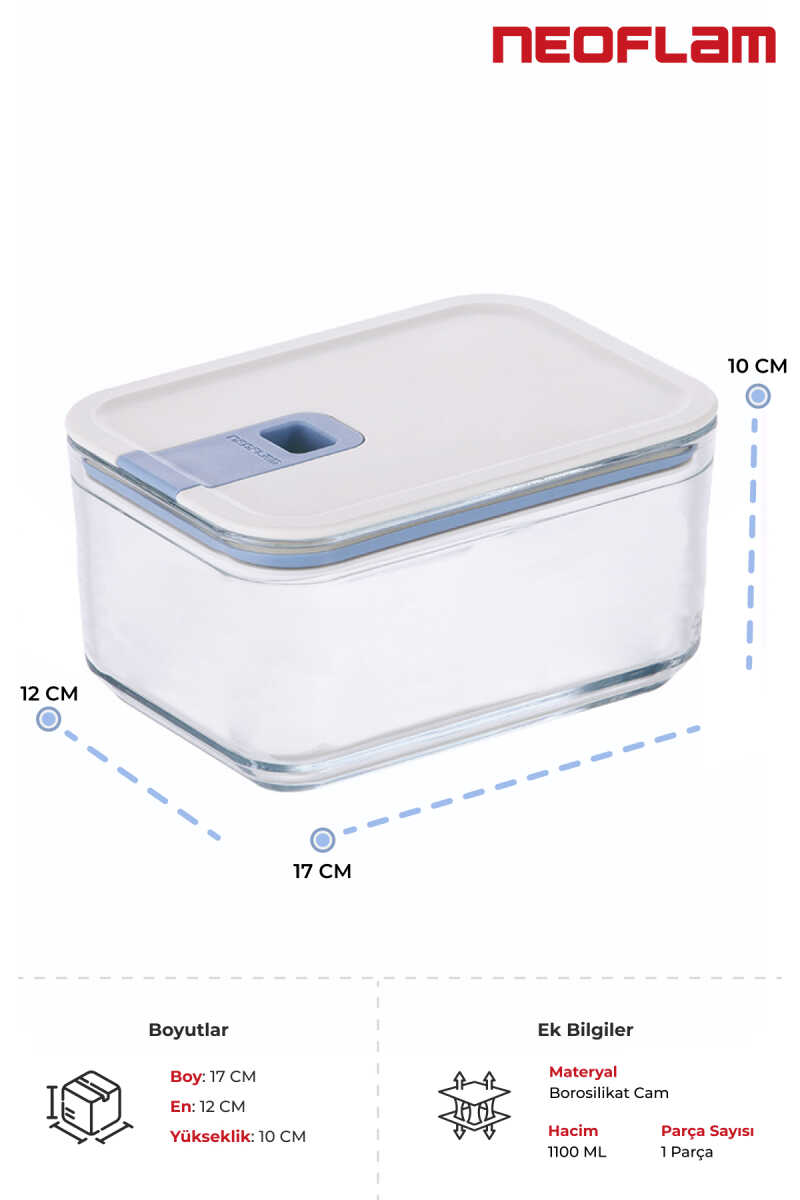 Neoflam Perfect Seal Dikdörtgen cam saklama kabı, mükemmel tasarımı ve 400 derece ısıya dayanıklı borosilikat cam gövdesi ile yiyeceklerinizi uzun süre ilk günkü tazeliğinde korur.