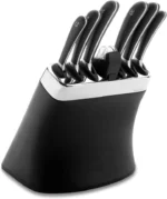 Signature bıçak bloğu, cilalı paslanmaz çelik bileziğe sahip dayanıklı mat siyah ABS’den yapılmıştır.