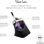 Bu bıçak bloğu, bıçak kenarlarını bilenmiş ve keskin tutmak için entegre bir seramik tekerlekli bıçak bileyici ile birlikte gelir. Her yuvadaki bir manyetik yer belirleyici, bıçağın omurgasını bloğa çekerek bıçakları takarken veya çıkarırken kesici kenarın hasar görmesini önler. Bıçak bloğu 6 bıçak alacak şekilde tasarlanmıştır.