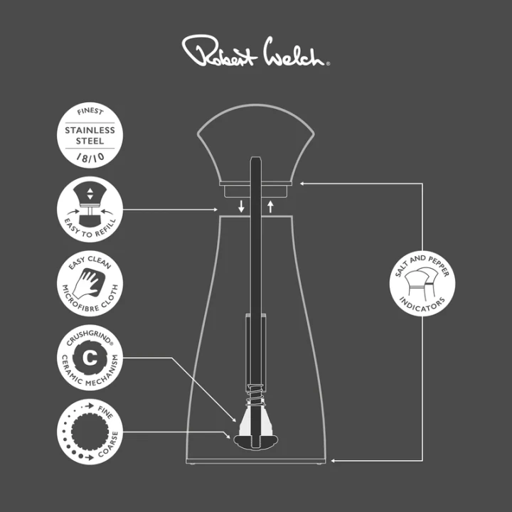 Şık İmza Parlak Orta Tuz Değirmen, en iyi 18/10 paslanmaz çelikten üretilmiştir. Değirmen, CrushGrind®’den incelikten kaba, üstten yeniden doldurulması kolay ve rahat ömür garantisi veren bir seramik mekanizmaya sahiptir. Zarif beyaz bir yaka ve taban, her yemeğin mükemmel bir şekilde terbiye edilmesini sağlayan bir tuz değirmeni olarak açıkça ayırt eder.