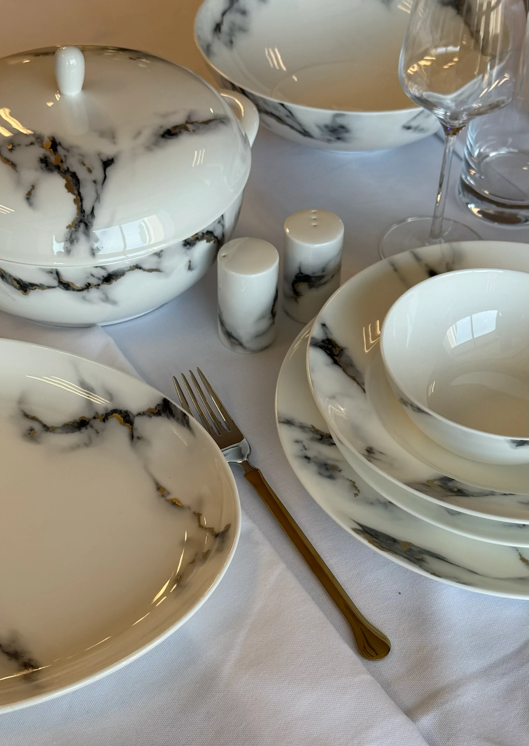 Doğadan ilham alan şıklığın modern yorumu: Prouna Marble yemek takımı. Mermer dokusunun doğal zarafeti ile minimal çizgilerin birleştiği bu özel koleksiyon, sofistike sofralar için tasarlandı. Hem çağdaş hem zamansız bir stil arayanlar için kusursuz bir tercih. Marble serisi, klasik mermer desenlerinin porselen yüzeydeki zarif yorumuyla öne çıkar. Beyaz ve gri tonların hâkim olduğu tasarıma, altın ya da platin kenar çizgileri eşlik eder. Bu sade ama etkileyici detaylar, yemek takımına hem doğallık hem de lüks bir görünüm kazandırır. Modern mimariden ve iç mekân tasarımlarından ilham alan bu koleksiyon, sade ama karakterli sofralar yaratmak isteyenler için idealdir. Marble serisi, yüksek kaliteli porselenden üretilmiş olup, hem estetik hem de dayanıklılık açısından üst düzey performans sunar. Mermer dokusu, özel tekniklerle uygulanmış ve her parçada doğal taş hissi yaratılmıştır. İnce kenar süslemelerinde kullanılan altın ya da platin detaylar el işçiliğiyle tamamlanır. Doğal taşın güçlü estetiği, modern yaşam tarzıyla birleşiyor. Prouna Marble, sade ama gösterişli bir tarz sunarak hem günlük sofralara hem özel gün davetlerine ayrıcalık katıyor. Minimal çizgileri sevenler için prestijli bir tercih.