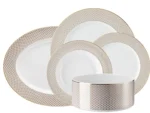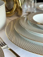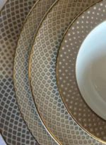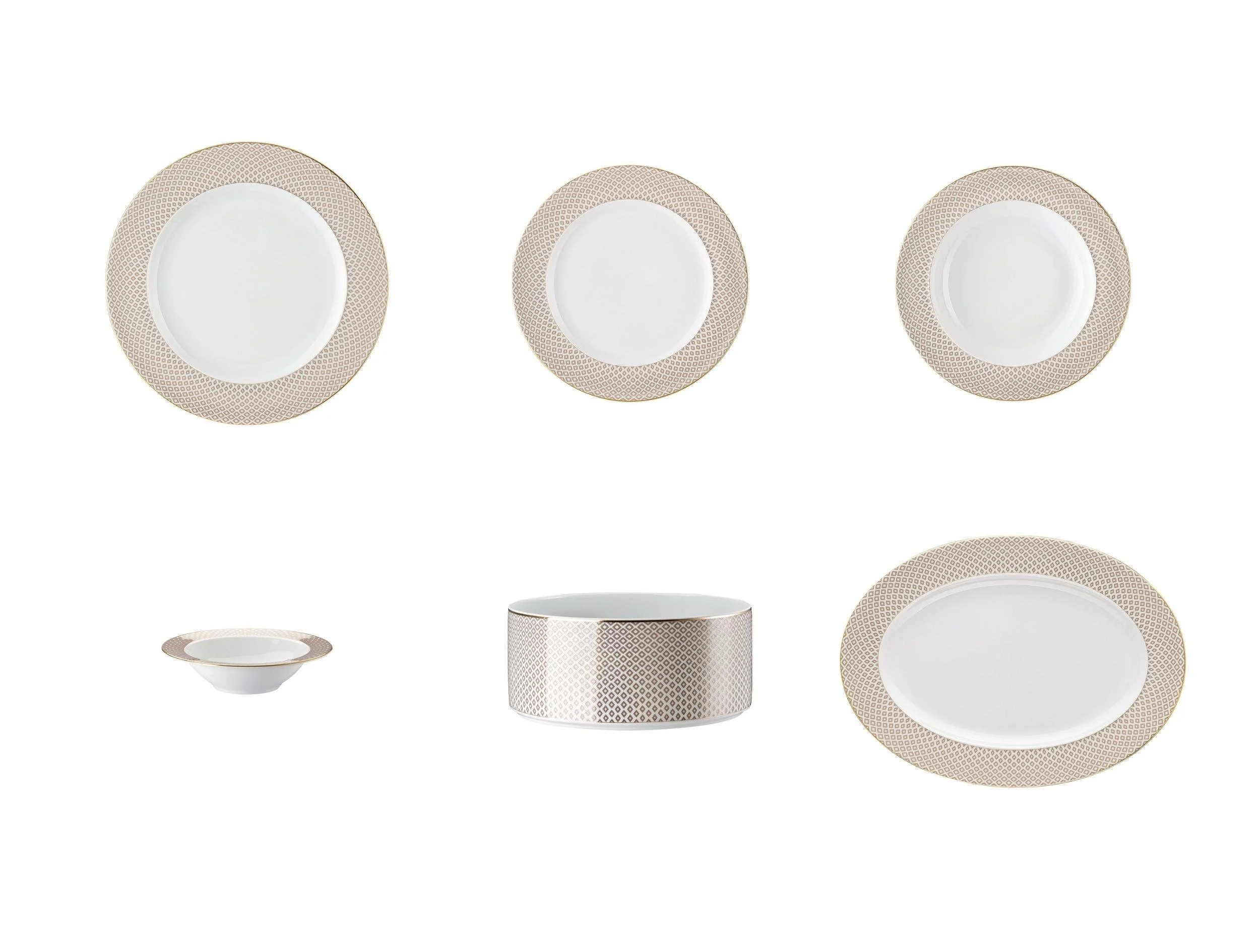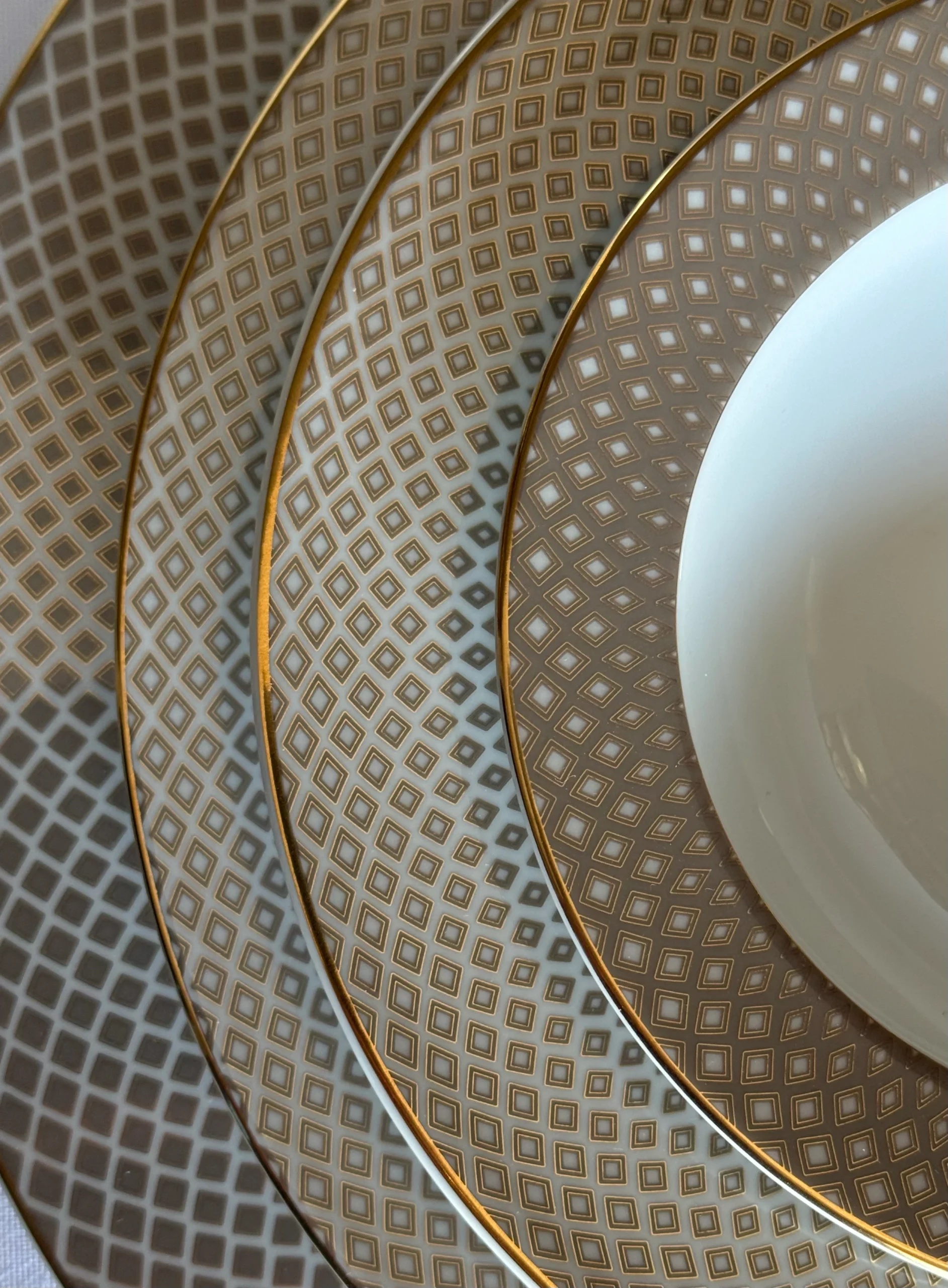 Francis formundaki Carreau dekorunda tarihi referanslar ve modern zarafet bir araya gelerek klasik, lüks ama aynı zamanda aydınlık bir masa düzeni yaratıyor. Kraliyet mavisi ve şehvetli bej tonlarındaki serbest ve dolgulu kareli yüzeylerin ince altın konturlarla etkileşimi, bir kaleydoskopa bakmayı anımsatan bir renk efekti yaratıyor. Özenle kullanılan beyaz yüzeyler, tasarıma sakinlik ve ferahlık katıyor ve Francis formunun net çizgileriyle harika bir şekilde uyum sağlayan heyecan verici bir açık-koyu kontrastı yaratıyor.