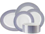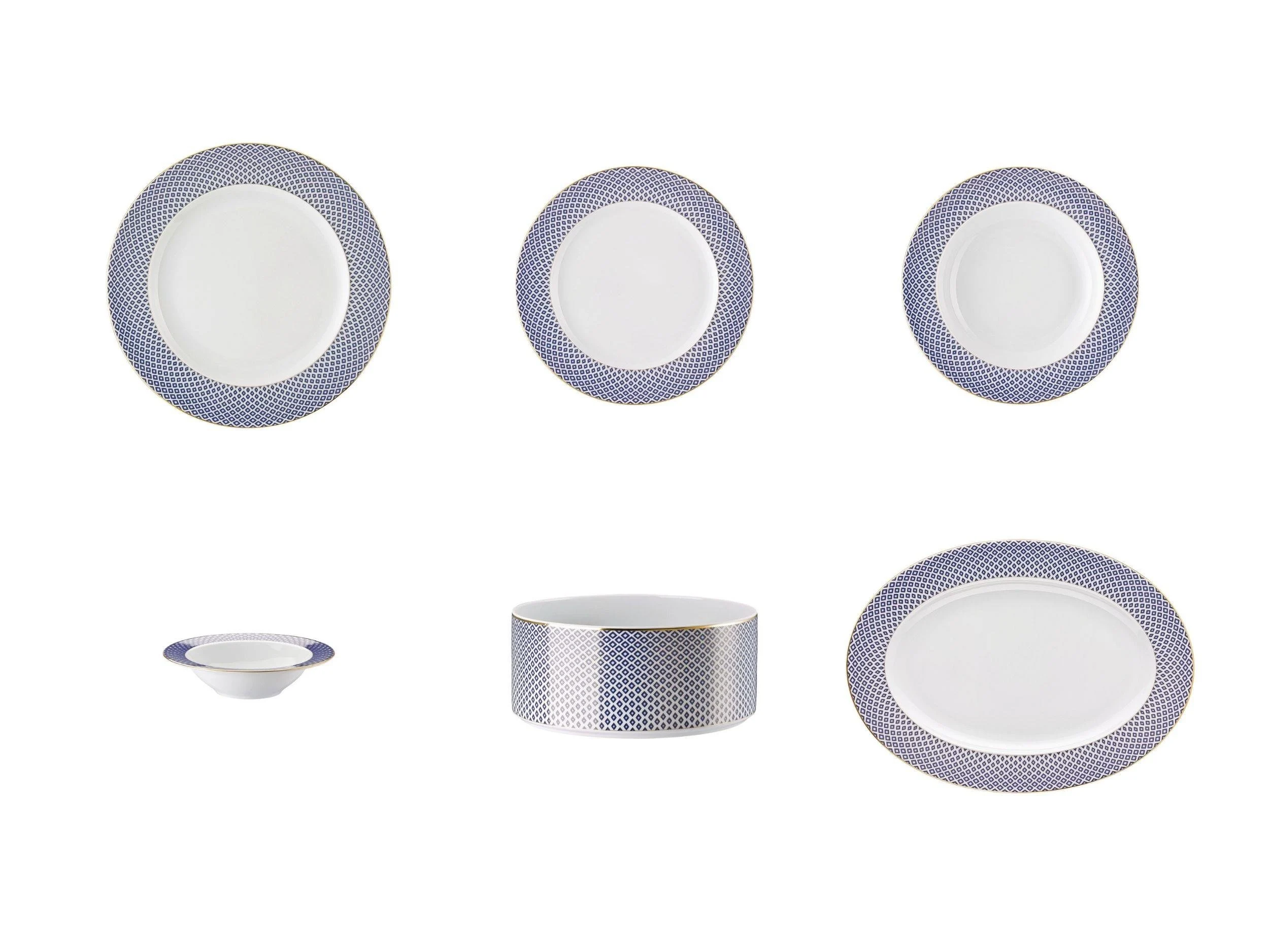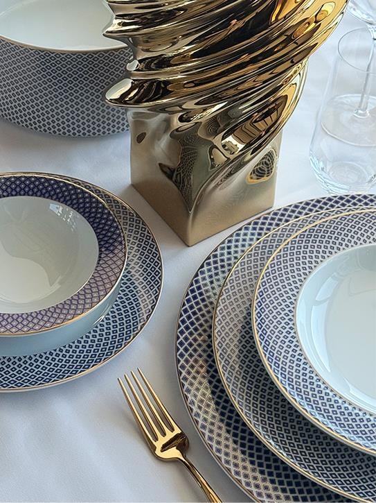 Francis formundaki Carreau dekorunda tarihi referanslar ve modern zarafet bir araya gelerek klasik, lüks ama aynı zamanda aydınlık bir masa düzeni yaratıyor. Kraliyet mavisi ve şehvetli bej tonlarındaki serbest ve dolgulu kareli yüzeylerin ince altın konturlarla etkileşimi, bir kaleydoskopa bakmayı anımsatan bir renk efekti yaratıyor. Özenle kullanılan beyaz yüzeyler, tasarıma sakinlik ve ferahlık katıyor ve Francis formunun net çizgileriyle harika bir şekilde uyum sağlayan heyecan verici bir açık-koyu kontrastı yaratıyor.