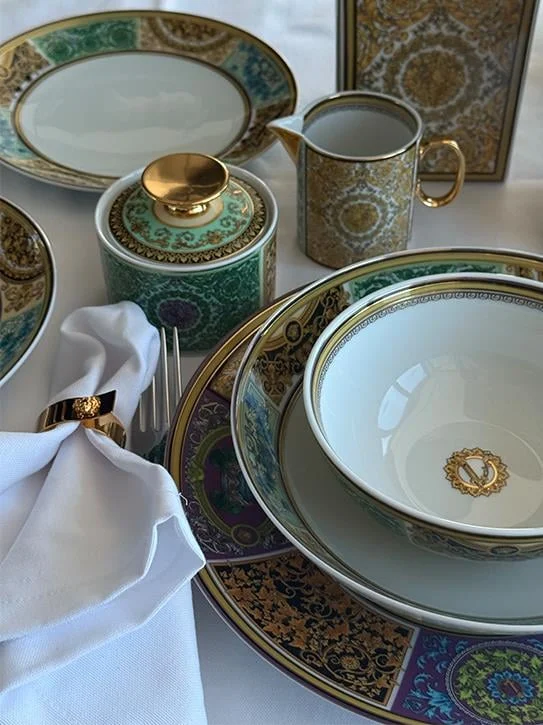 Yeni Barocco Mosaic yemek koleksiyonu, markanın mirasını kutlayan bir tasarımdır. Dört arşiv baskısı, tam anlamıyla Versace’yi yansıtan bir tasarımda birleştirilmiştir. Renkler parlak, neşeyle ve enerjiyle doludur – pastel mor ve yumuşak nane yeşili, klasik altın tonlarıyla birleşerek taze bir görünüm yaratır.