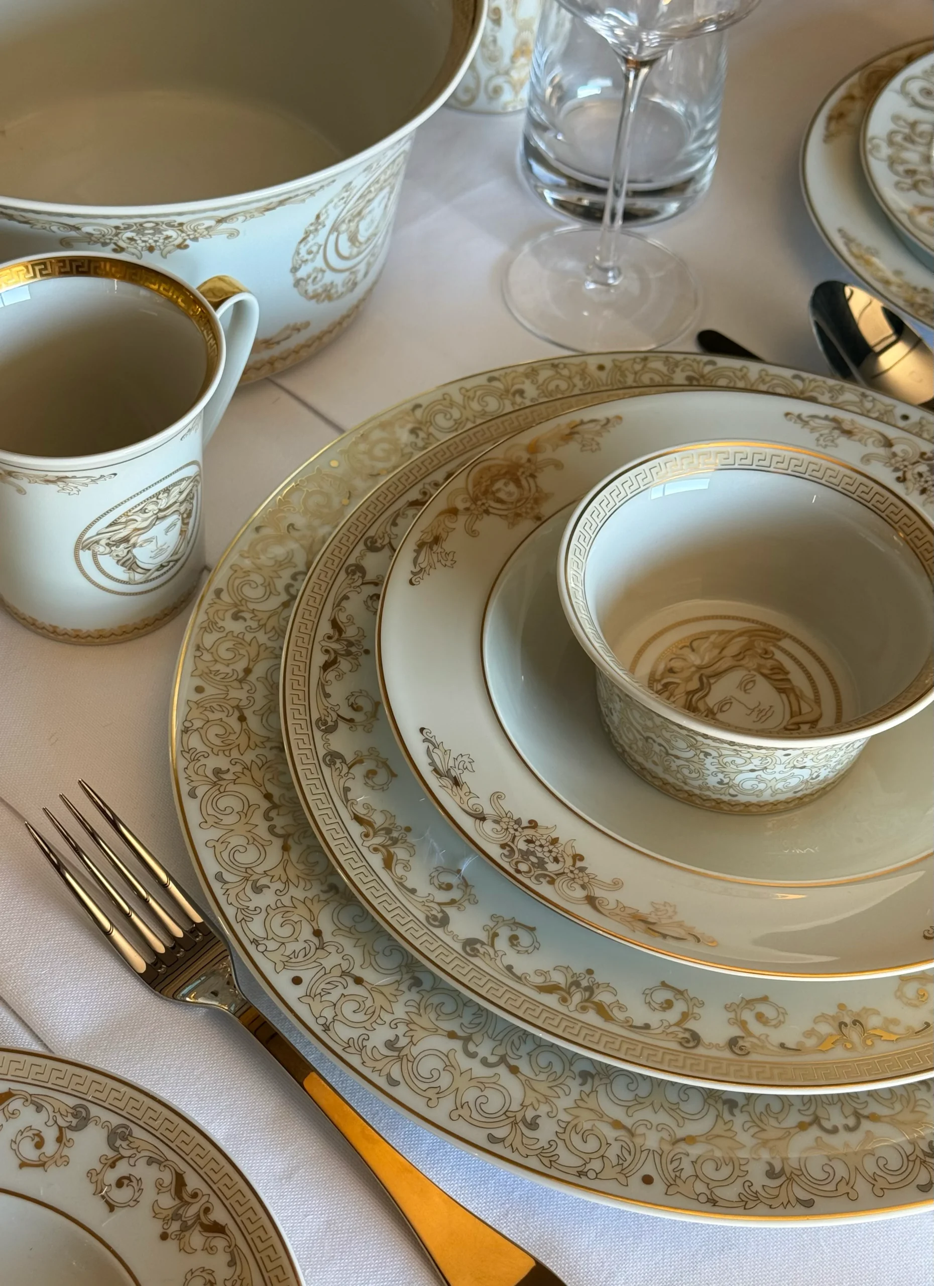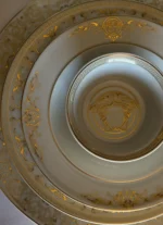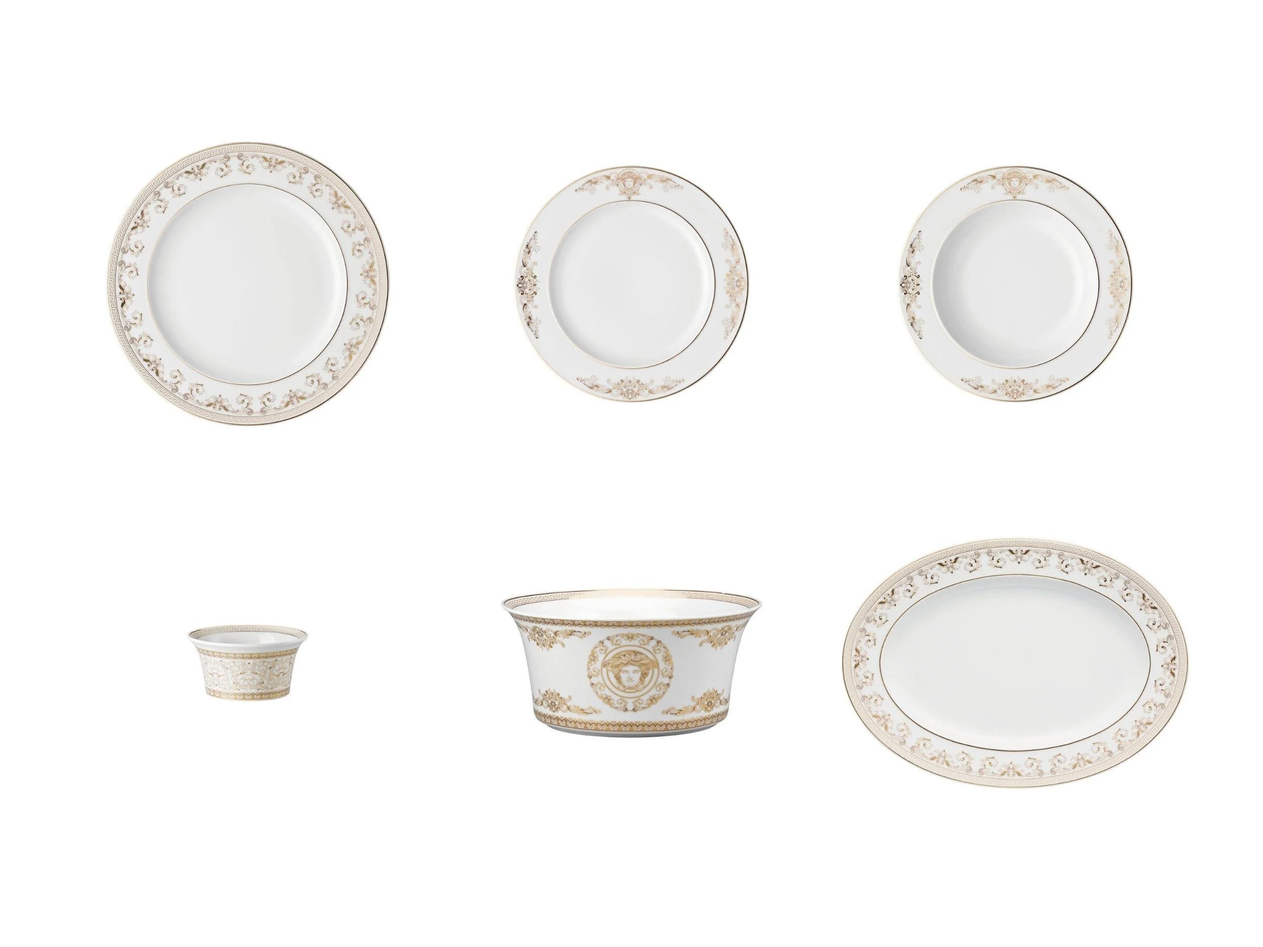 Bu tasarım, ihtişamlı akşam yemeklerinin ambiyansından ilham alarak, geleneksel Versace motiflerini; ikonik Medusa başı ve karmaşık Barok süslemeleri beyaz ve altınla zıt bir şekilde harmanlayarak çağdaş bir masa düzeni oluşturuyor. “Medusa Gala Gold” serisi, tam yüz altın tüylü ve kurdele motifleriyle daha da lüks bir hâl alıyor.
