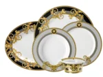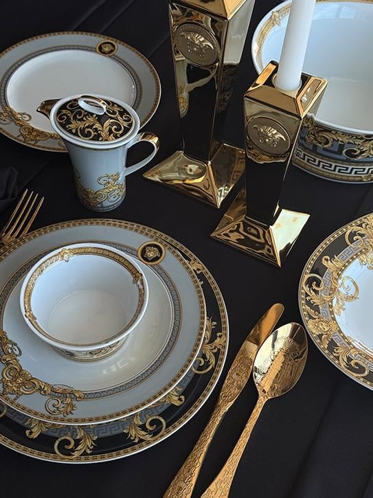 Altın barok unsurlar ve cesur bir gümüş Yunan anahtarı, lüks bir vazonun ve iki heybetli aslanın etrafını çerçeveler – “Prestige Gala” koleksiyonunun etkileyici detayları. İkonik Versace baskısı “Le Vase Baroque”tan ilham alarak tasarlanan bu tasarım, altın ve platin süslemelerle zenginleştirilmiş ve siyah ile turkuaz tonlarında vurgulanmıştır.