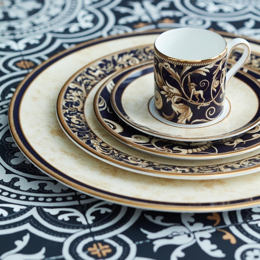 Cornucopia ile efsanevi bolluk boynuzunu sofralarınıza taşıyın. Bu bereketli boynuz, Yunan efsanesine uygun bir desen oluşturmak için tek boynuzlu atlar gibi efsane yaratıklarla birleştirilir. Bu koleksiyonun efsanesi, fildişi parşömen şeridi, koyu lacivert kurdeleler, koyu sarı vurgulu bordür ve parlak 22 ayar altın çerçeve ile tarihin yıllıklarına daha da kazınmıştır – hepsi ipeksi beyaz ince kemik çini üzerine ustalıkla dekore edilmiştir.